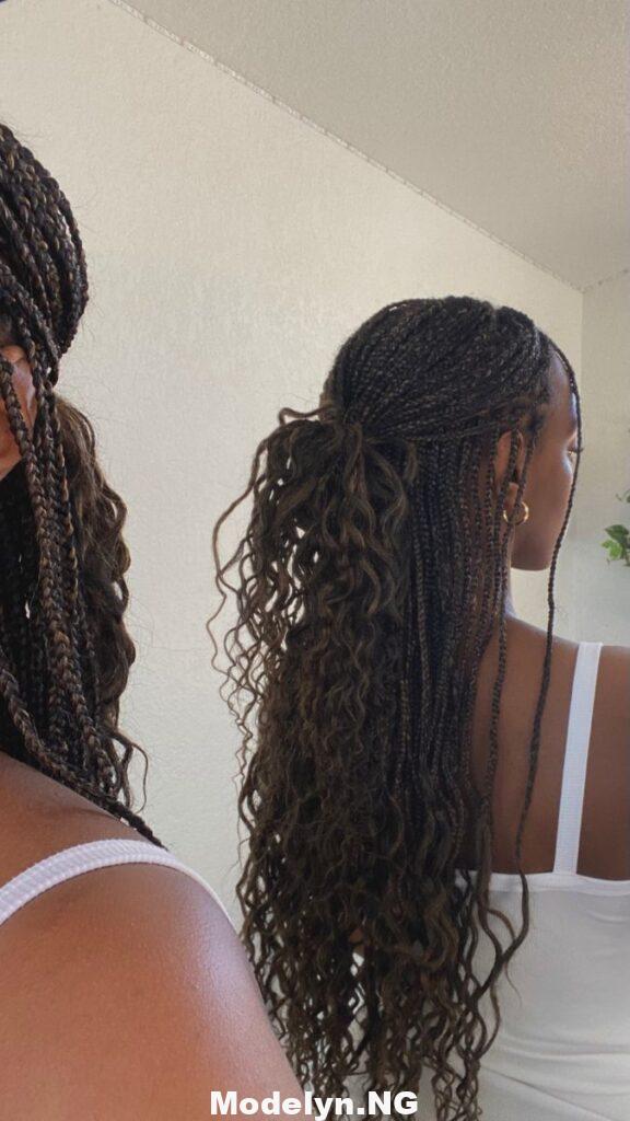 Boho braids are the perfect mix of fine and playful. They’re lightweight, easy to style, and always in fashion. The loose curls give your hair a soft, pretty look, and the best part is that even when they get older, they still look nice. You can wear them in a bun, leave them hanging, or pack them half-up when you’re going for a fun, girly vibe. A little mousse on the curls here and there is all you need to keep them fresh throughout the month.